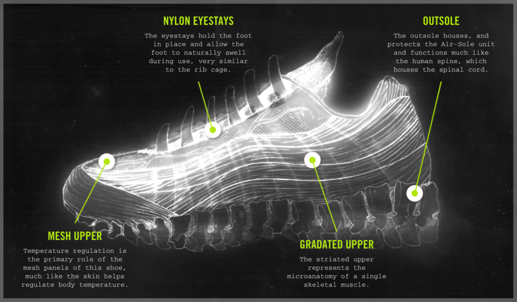 Sergio va alors retourner s’inspirer, et c’est en ouvrant un bouquin sur l’anatomie qu’il décide de s’inspirer du corps humain pour réaliser la silhouette de la Air Max 95. Il représente ainsi les muscles, les vertèbres et la peau, en utilisant différents matériaux qui viennent rappeler comment le corps humain est composé.